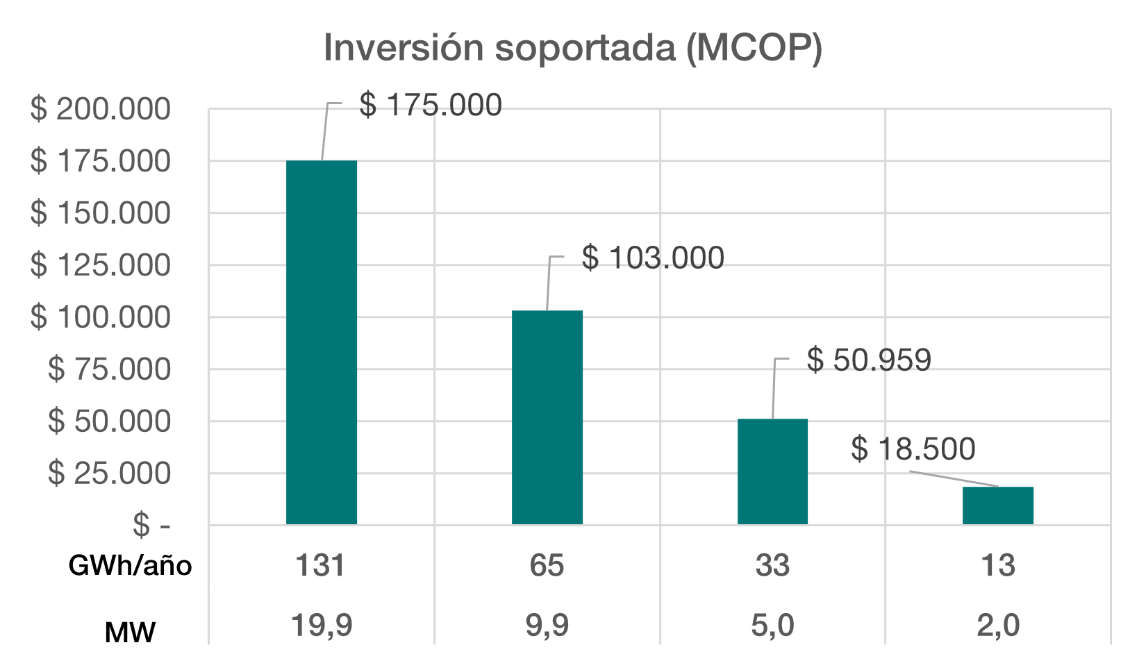 Analizando cuatro casos de PCHs de 19,9 MW, 9,9 MW, 5,0 MW y 2,0 MW, suponiendo en cada caso un factor de planta de 0,75 y un precio de bolsa de 180 COP/kWh (proyecto para el SIN), en la Figura 1 se presenta la inversión que soportarían los distintos tamaños de proyecto para garantizar una TIR del accionista del 13%. Así, por ejemplo, un proyecto de 19,9 MW, con una generación de 131 GWh/año, la inversión total no debería superar los COP 175.000 millones; así mismo, en el caso de una PCH de 2,0 MW y generación de 13 GWh/año, la inversión total debería rondar los COP 18.500 millones para lograr dicha TIR.