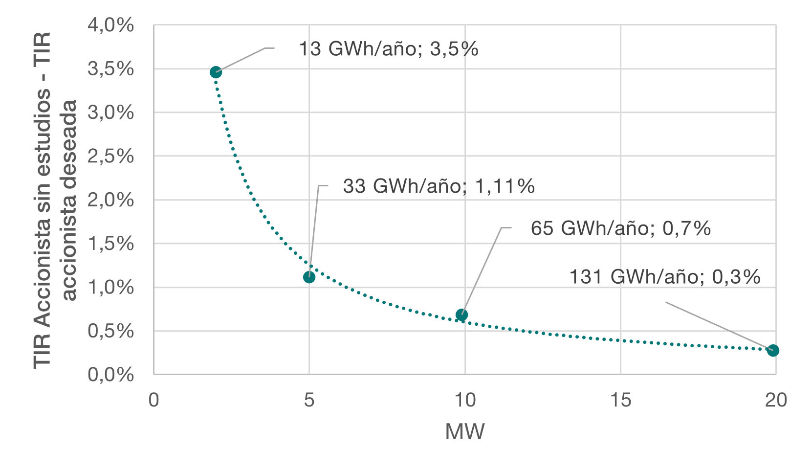 Mientras que para un proyecto de una generación de 131 GWh/año (19,9 MW) los estudios de licenciamiento pueden representar alrededor de 30 puntos (0,3%) en la TIR, para un proyecto con una generación de 13 GWh/año (2 MW), puede representar 350 puntos (3,5%) en la TIR del accionista, lo que explica la búsqueda de eficiencias desde estas fases del desarrollo de los proyectos, sobre todo en proyectos con una baja generación o capacidad instalada.