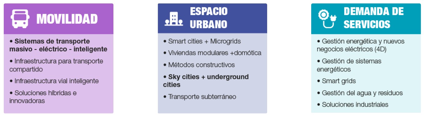 Para Integral son claros tres vectores de transformación: Movilidad, espacio urbano y demanda de servicios, resaltando de ellos oportunidades concretas frente a la implementación de infraestructura para el sistema de movilidad eléctrico, desarrollos enfocados a ciudades inteligentes, soluciones para el uso de espacios subterráneas, servicios en gestión de sistemas energéticos, y el diseño y desarrollo de sistemas de gestión de agua y residuos como se ve en la gráfica.