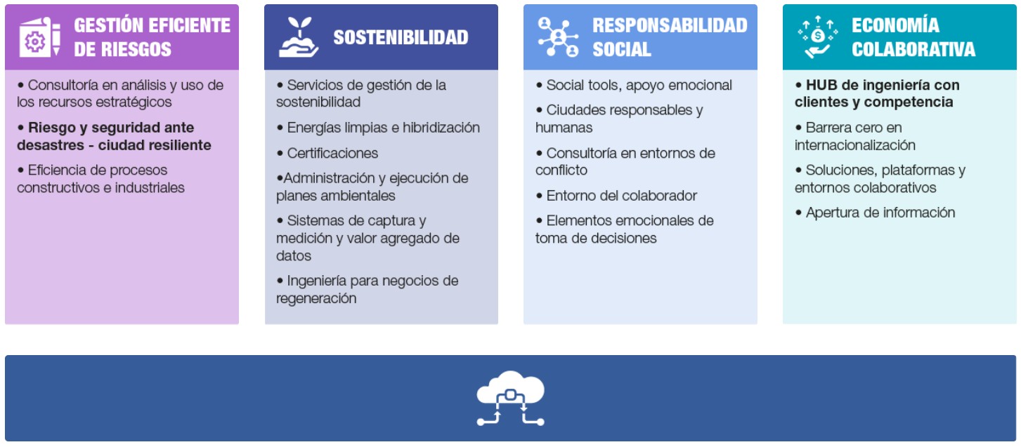 Internamente el grupo empresarial ha tenido inversiones importantes en metodologías y herramientas que contribuyen al cambio tecnológico. Es así como se han constituido una sinergia entre las áreas de Building Information Modeling (BIM), Sistemas de Información Geográfico (SIG), Innovación (INN) y Tecnologías de la Información y computación (TICs), áreas que vienen trabajando de la mano para el plan de transformación digital.