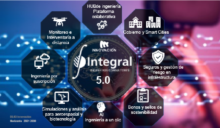 La gráfica anterior muestra ejemplos de lo que está en el plan de desarrollo de Integral para hacer ingeniería inteligente, soluciones como gestión de activos a través de metodologías BIM y SIG, aplicando realidad aumentada, integración de sistemas, gemelos digitales y computación en la nube, con resultados ya en práctica en frentes tales como la digitalización de procesos en campo, y automatización de procesos como la detección de amenazas de deslizamiento por la metodología Hillslope Quality Index que está siendo lanzada como una nueva oferta de valor para la gestión de riesgo de proyectos lineales, La oferta de BIM en captura de la realidad, realidad virtual, simulación y entornos SIG, simulación de ruteo tridimensional, análisis predictivo mediante elementos finitos e inteligencia artificial, la implementación de una Data Warehouse entre otros desarrollos internos como la complementación de tecnologías digitales a las soluciones de arqueología.